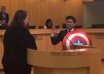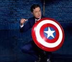 Stephen Colbert with the shield given to him after the ‘death’ of Cap in the comics