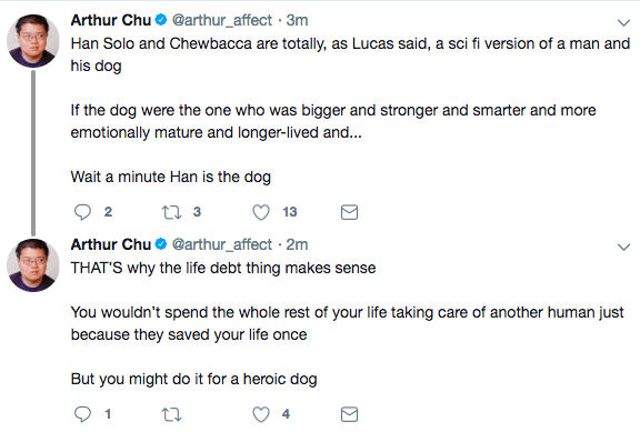 “Yeah, man, we can get you to Alderaan, but I got this rescue human, he wasn’t very well socialized and he can be little aggressive sometimes. Come on, let’s see how he reacts to you.”