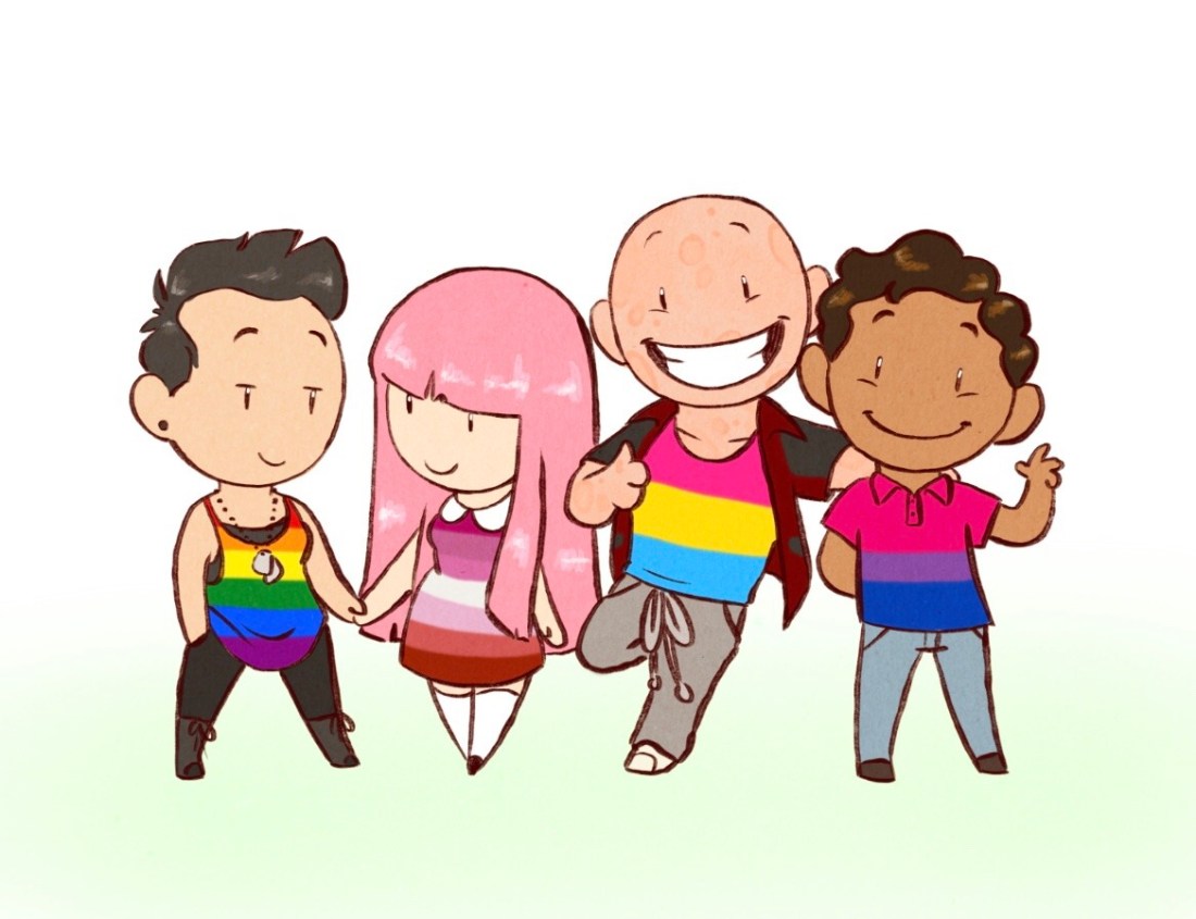 We don’t know exactly what Ellie and Yukio are, but they have only expressed attraction to women; each other. I thought it’d be cute if all the characters wore different flags so Yukio got the pink lesbian flag that match her hair.