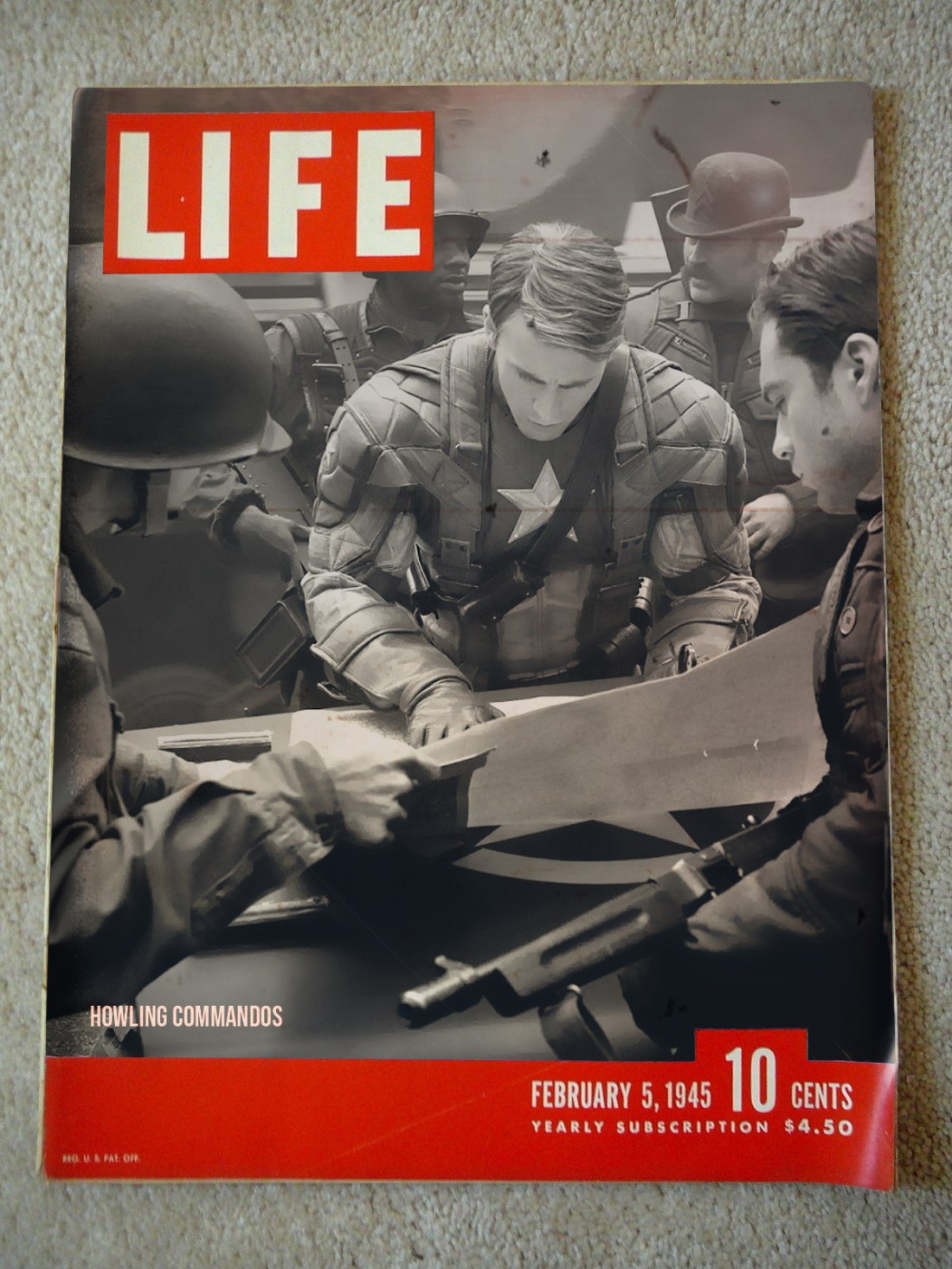 Vintage cover, featuring a WWII image of ‘Captain America’ Steve Rogers and Howling commandos Gabe Jones, James Barnes, Timothy ‘Dum Dum’ Dugan, and an unnamed soldier. This issue was printed before news broke that Captain America had been officially deemed Missing in Action.