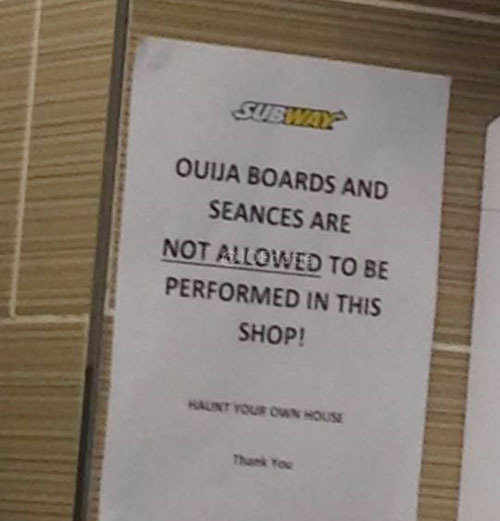 …I demand more information about this Subway shop. Why did they feel it necessary to hang this sign up? How many times have they had to chase people out who were trying to summon something? Have gangs of mediums just taken up their seats, ordered their subs, and then proceeded to try and commune with the departed? Are the subs an offering? Is their shop actually haunted now? These are questions I demand answers to!