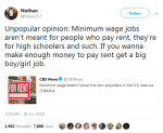 not to mention, if minimum wage was meant solely for high school students how would the business survive when students are in school?? are they only supposed to be open on the weekend? this “unpopular opinion” makes no sense.