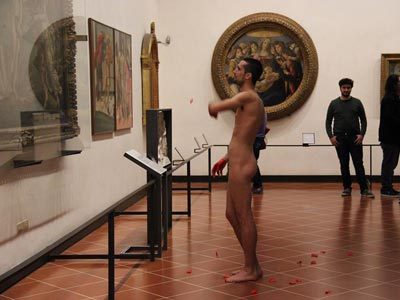 A naked Spanish men throws flower petals at the picture of the Birth of Venus by Botticelli
