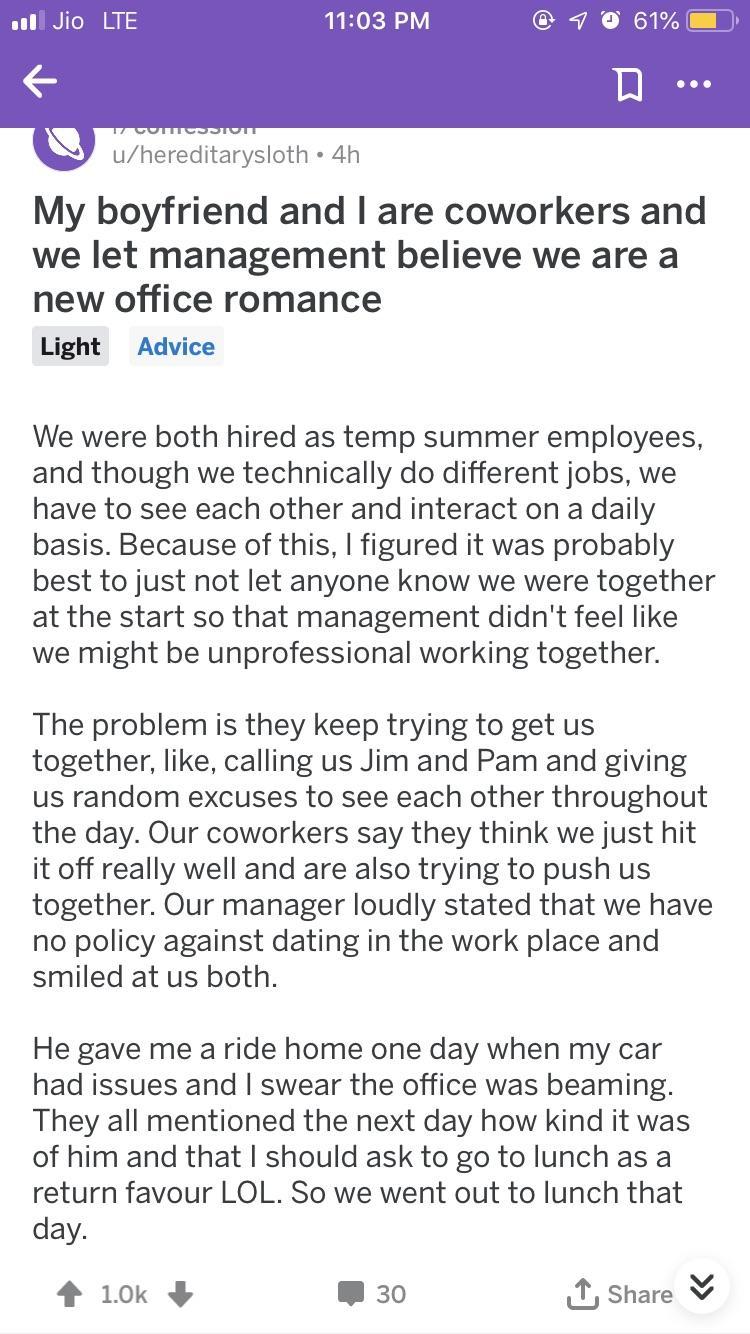 The couple pretends like they’re not together in office and the entire office is trying to set them up. This is so wholesome.